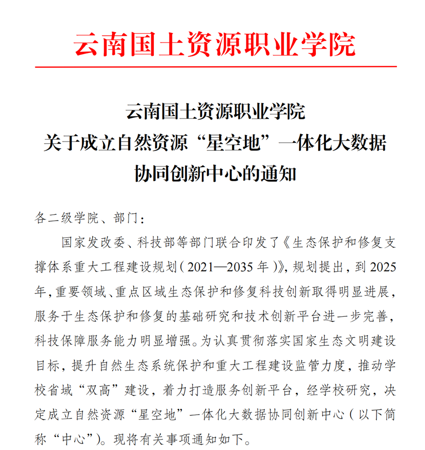 2022年5月,在第一轮省双高专业群“国土资源调查与管理”的建设中,学校前瞻性布局科技创新平台建设,成立“自然资源‘星空地’一体化大数据协同创新中心”校级科研平台。在高质量助推低空经济在专业建设、人才培养的同时,国土空间信息学院也在有组织开展低空经济相关联科技创新。先后立项“保护区典型树种空天遥感识别与结构参数反演”等多项低空相关科研课题。2025年10月,学校立项云南省教育厅高原山地低空遥感创新应用工程研究中心,聚焦国家发展战略和高原山地复杂地理环境地域特色,开展高原山地低空遥感建模与数字景观可视化等三个方向的研究,预期能够形成较大影响力的低空力量;2025年12月,立项云南省沈占锋专家工作站,这是学校在省级科研平台上取得的新突破,工作站引入中国科学院专家团队,以阳宗海流域为研究示范区,聚焦低空遥感技术解决流域农业种植与生态环境监测评价问题,将有力提升学校的科技及服务地区的水平,提升社会影响力。