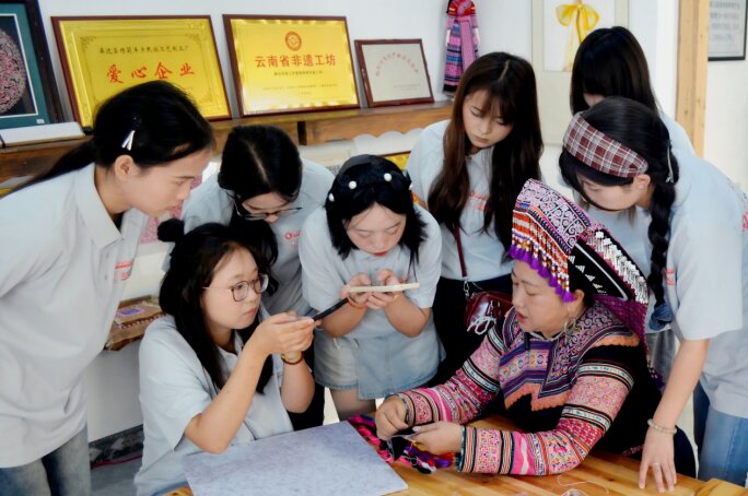年轻学子们全神贯注,在一针一线的往复中感受着古老的民族文化。这是云南国土资源职业学院珠宝旅游学院“向美同行”中华文脉传承实践团在屏边的暑期实践活动场景。