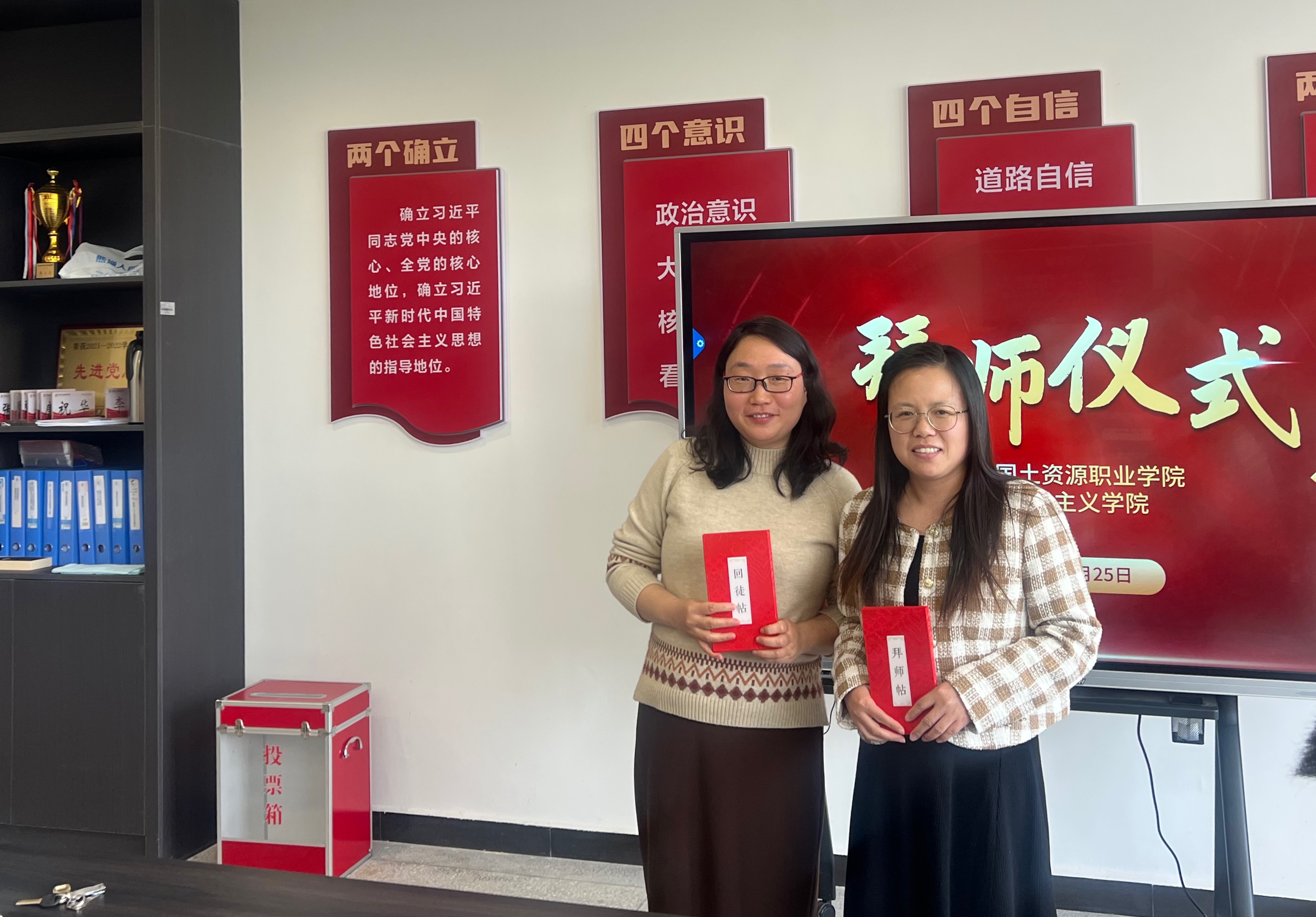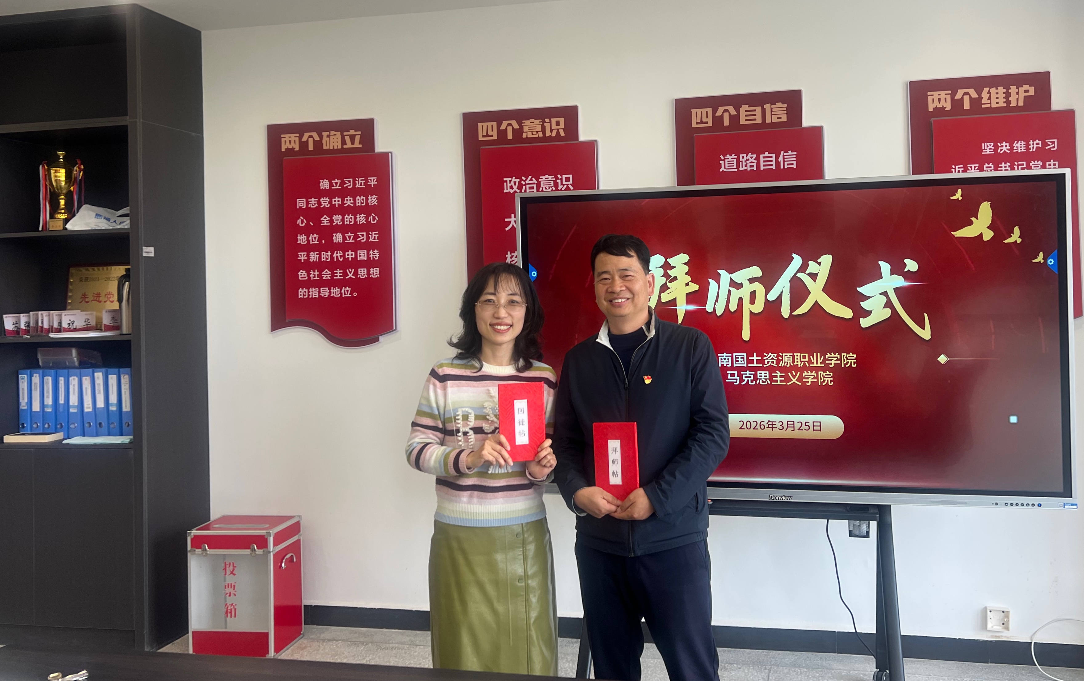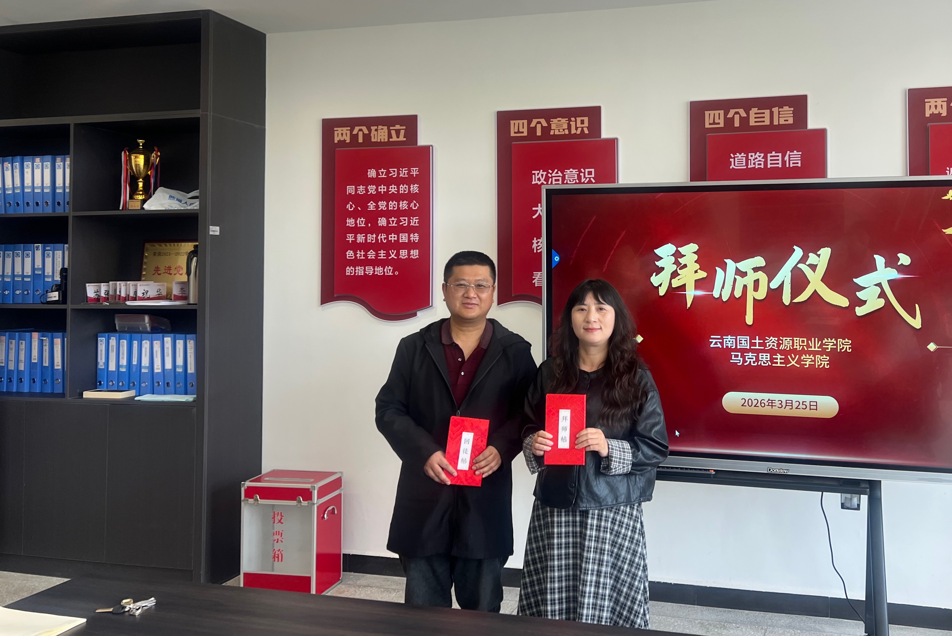 会议为新调入学院教师举行了拜师仪式,三对师徒互换师徒帖,互相帮扶,建强思政课教师队伍,提高思政课教学质量。